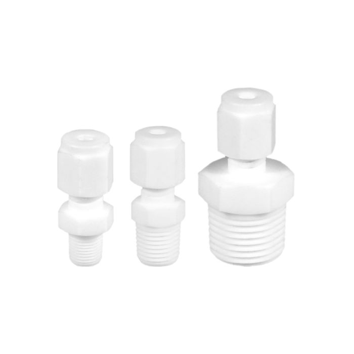PTFE adjustable compression fittings to suit tube diameters 3.0mm, 4.0mm and 6.0mm. Supplied with 1/8 inch, 1/4 inch and 1/2 inch BSP Tapered thread options. Each fitting is supplied with a single ferrule (olive).